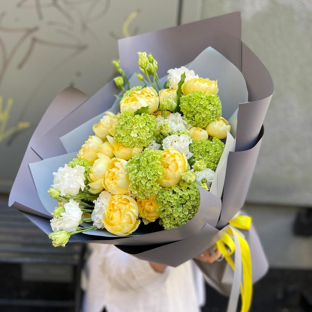 Вибурнум – 3 шт.Лента атласная – 2 шт.Пленка матовая – 7 шт.эустома махровая белая – 3 шт.роза кустовая пионовидная желтая – 5 шт.