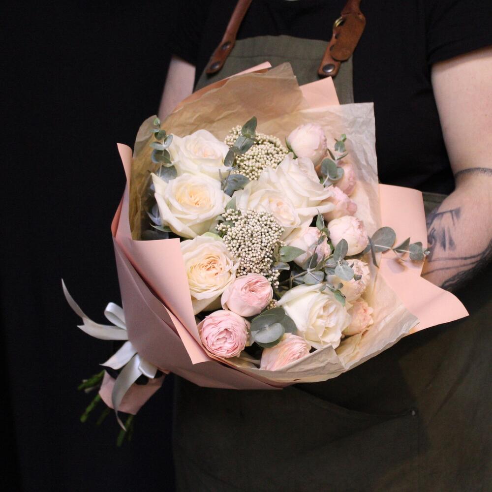 роза кустовая пионовидная mansfield park – 3 шт.роза пионовидная white o’hara – 6 шт.Озотамнус – 2 шт.Эвкалипт – 2 шт.Тишью – 2 шт.Пленка дизайнерская – 2 шт.Лента атласная – 1 шт.