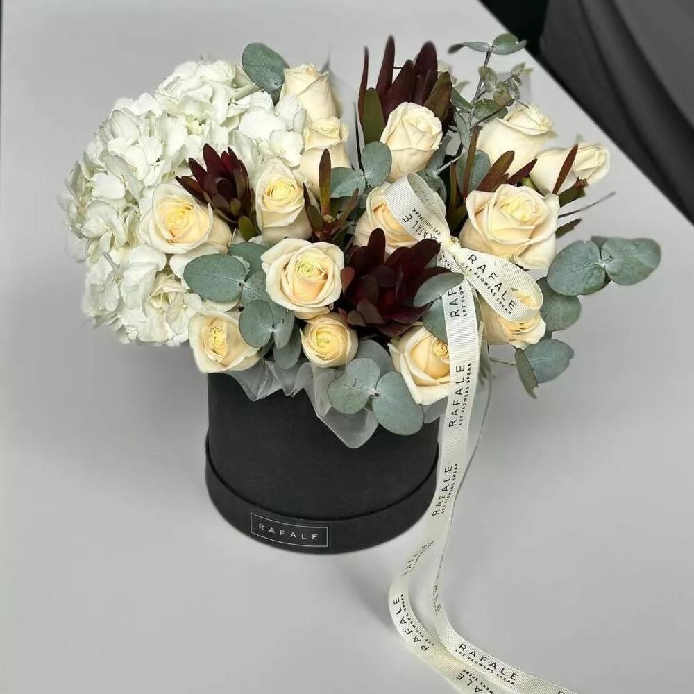 Роза Голландская – 15 шт. Гортензия – 1 шт. Сафари – 2 шт. Эвкалипт – 3 шт. Коробка шляпная – 1 шт.