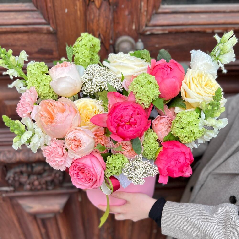 Вибурнум – 2 шт.Озотамнус – 2 шт.Лента атласная – 2 шт.Тишью – 1 шт.Диантус – 3 шт.Коробка шляпная – 1 шт.Роза остина пионовидная – 2 шт.Оазис флористический – 1 шт.Эустома белая махровая – 1 шт.джульетта роза пионовидная – 1 шт.Пион коралл шарм – 3 шт.антиринум – 3 шт.роза кэндллайт – 3 шт.