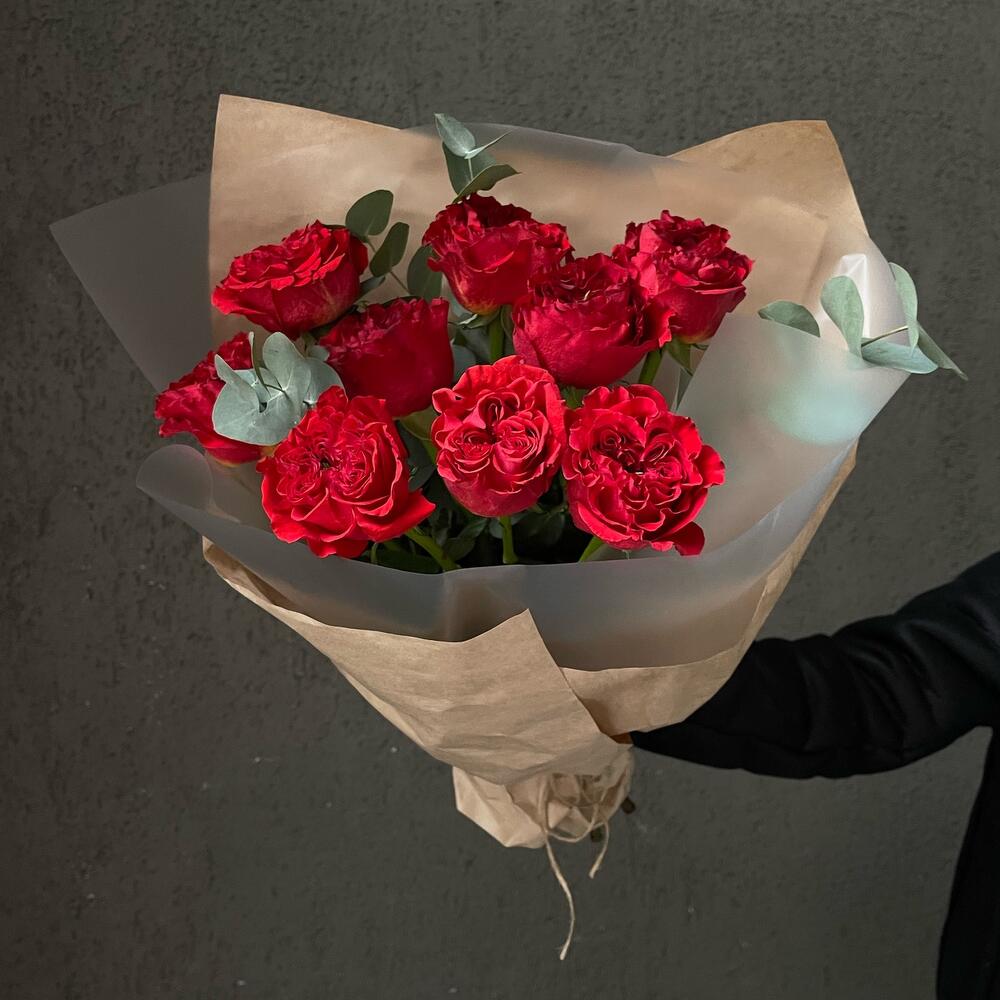 Эвкалипт – 3 шт.Роза пионовидная – 9 шт.Упаковка дизайнерская – 3 шт.