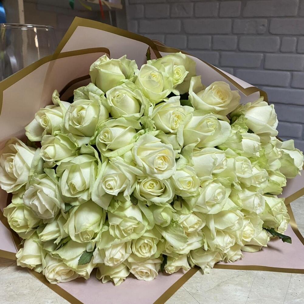 роза украинская белая – 51 шт. оформление калька – 1 шт. Стеклянная ваза – 1 шт.