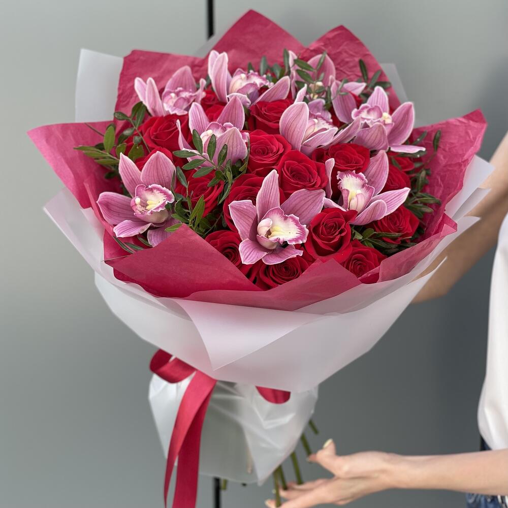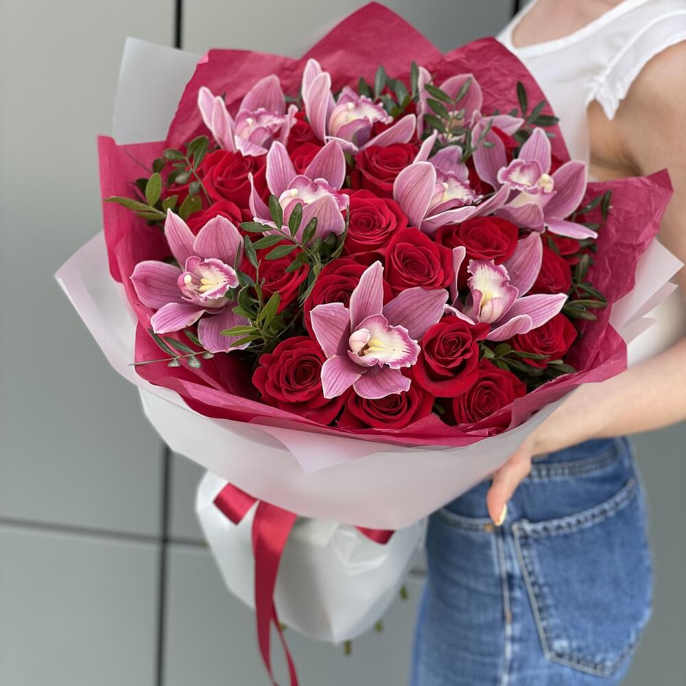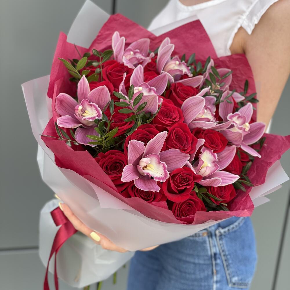 Букет из красных роз, цветков орхидеи и зелени в стильном оформлении!