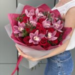 Букет Бурж с красными розами и цимбидиумом