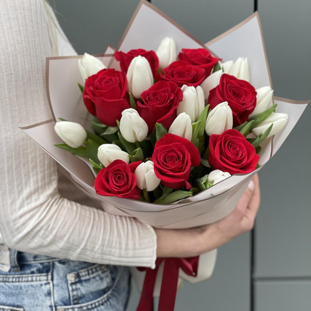 Букет из красных роз сорта фридом и белых тюльпанов в оформлении!