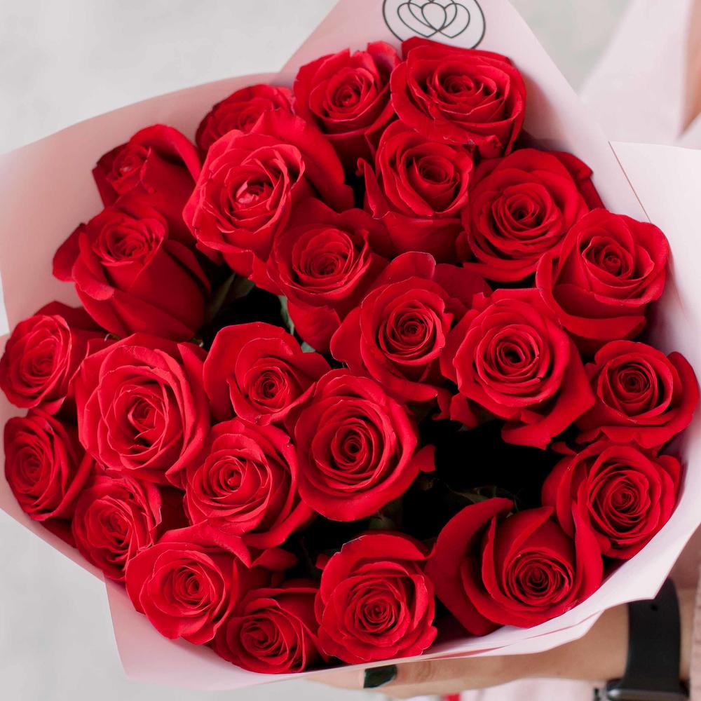 Букет из 25 красных роз (Эквадор) 70 см Freedom в розовой пленке