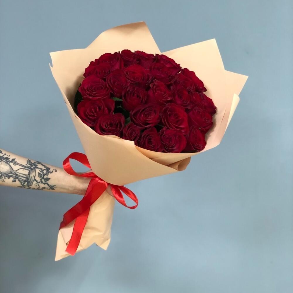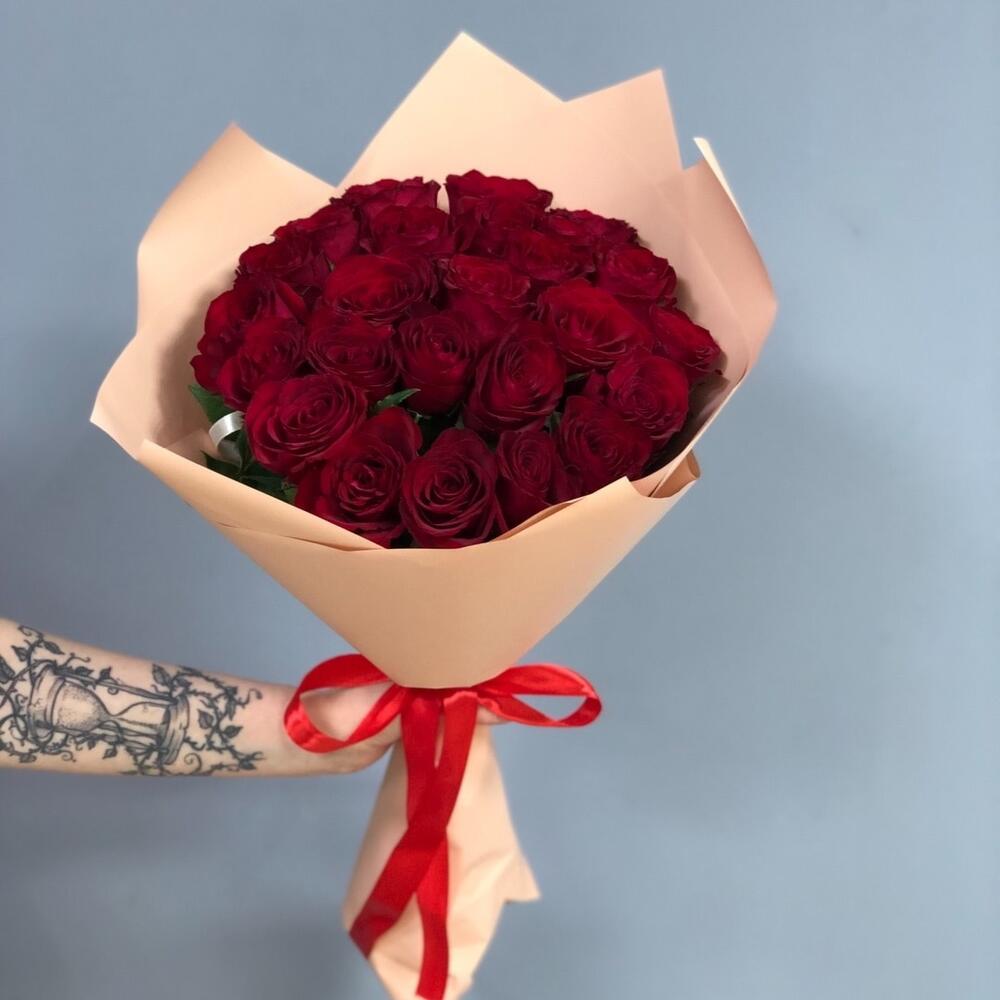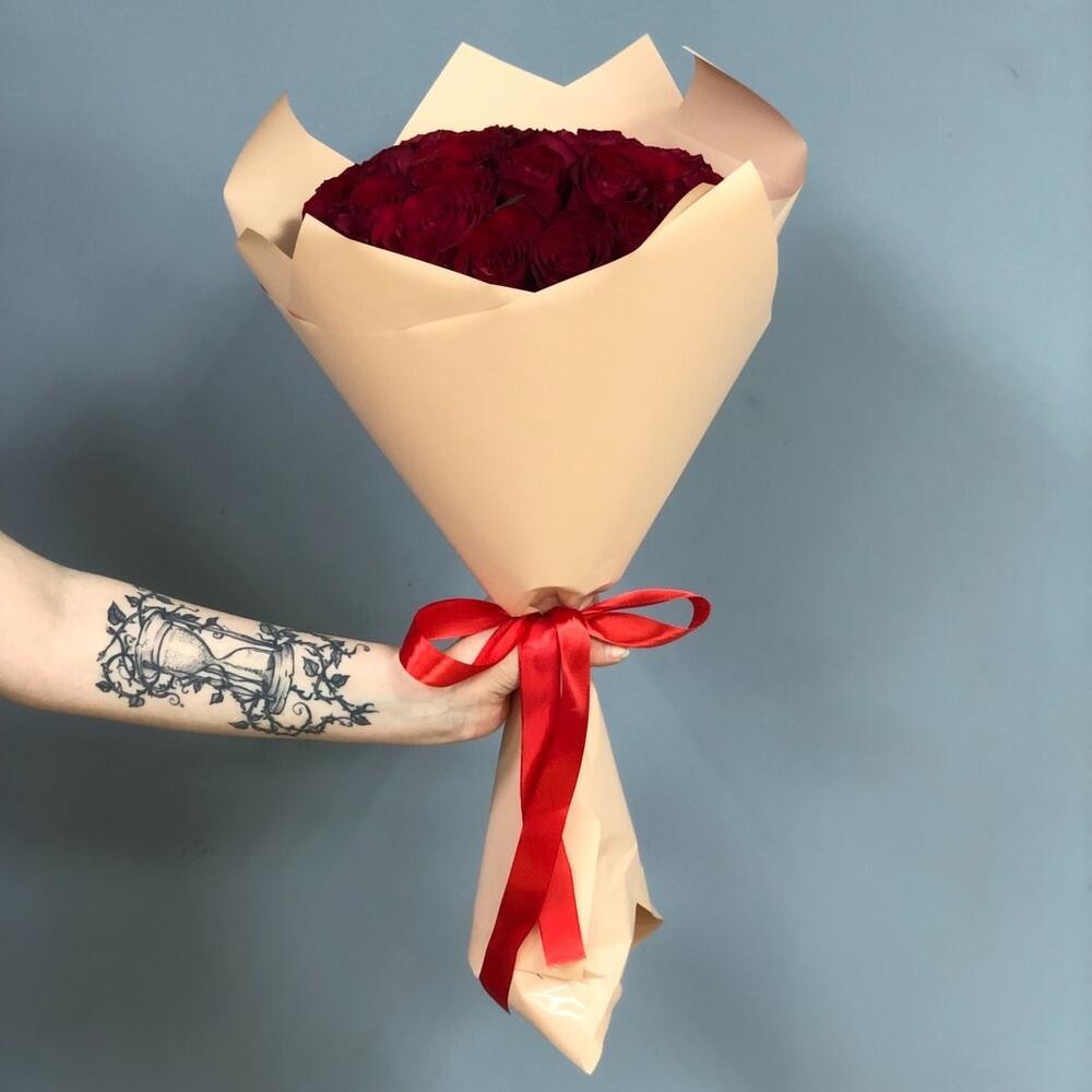 Букет из 25 красных роз в упаковке
