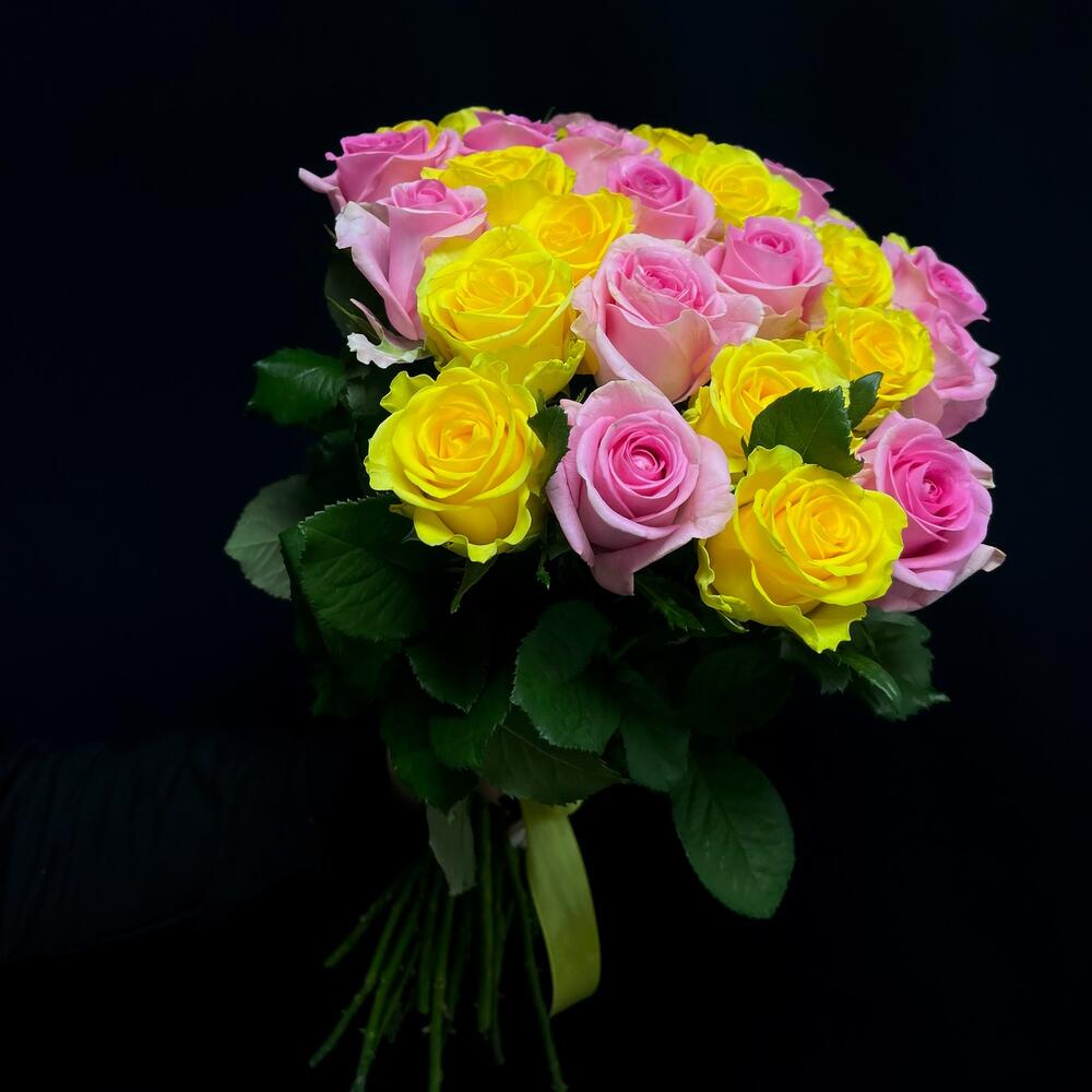 Розовая роза – 14 шт.Желтая роза – 16 шт.Лента атласная – 1 шт.