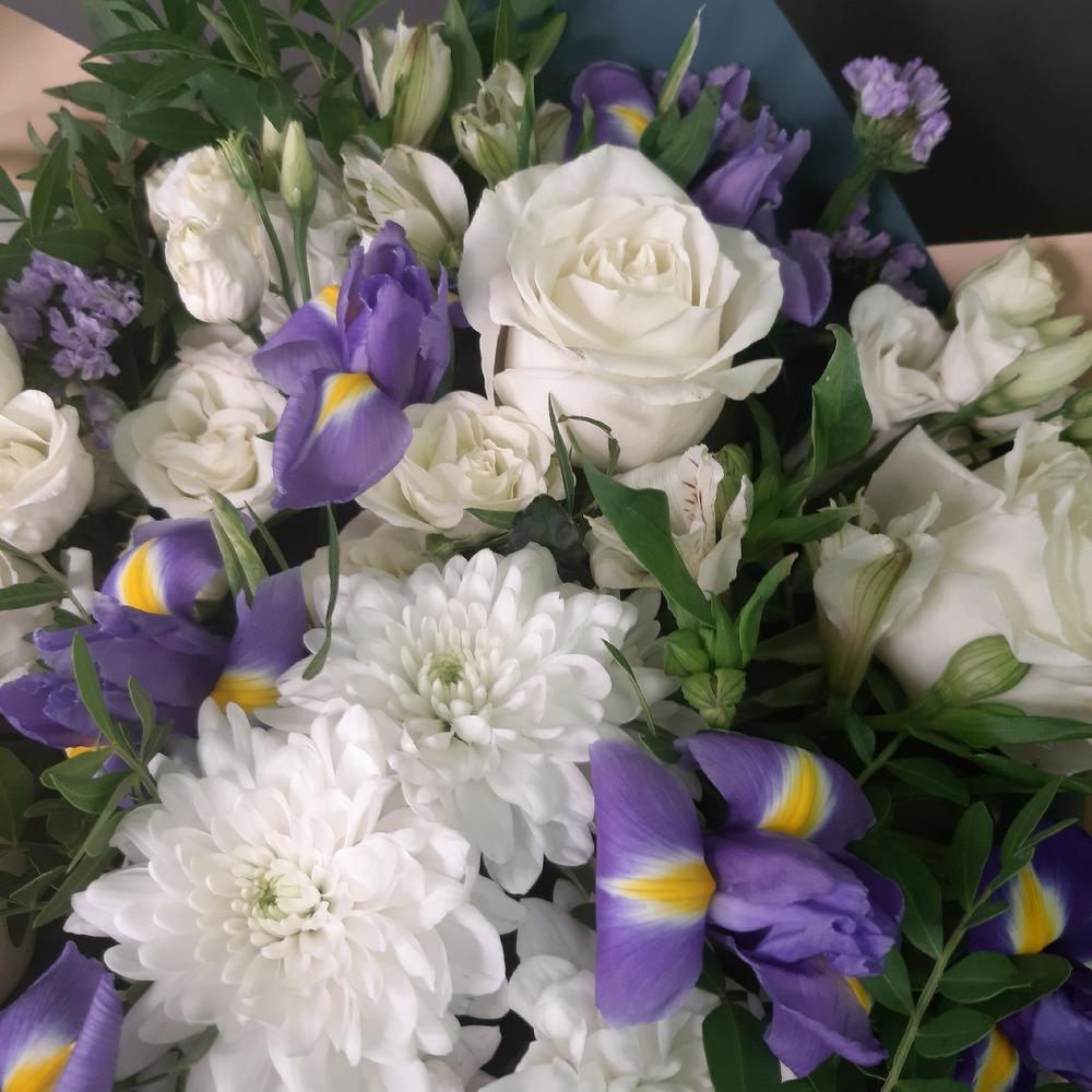 Роза Эквадор – 3 шт.Ирис Blue Magic – 6 шт.Лизиантус – 2 шт.Хризантема кустовая – 2 шт.Зелень – 5 шт.Упаковка дизайнерская – 3 шт.