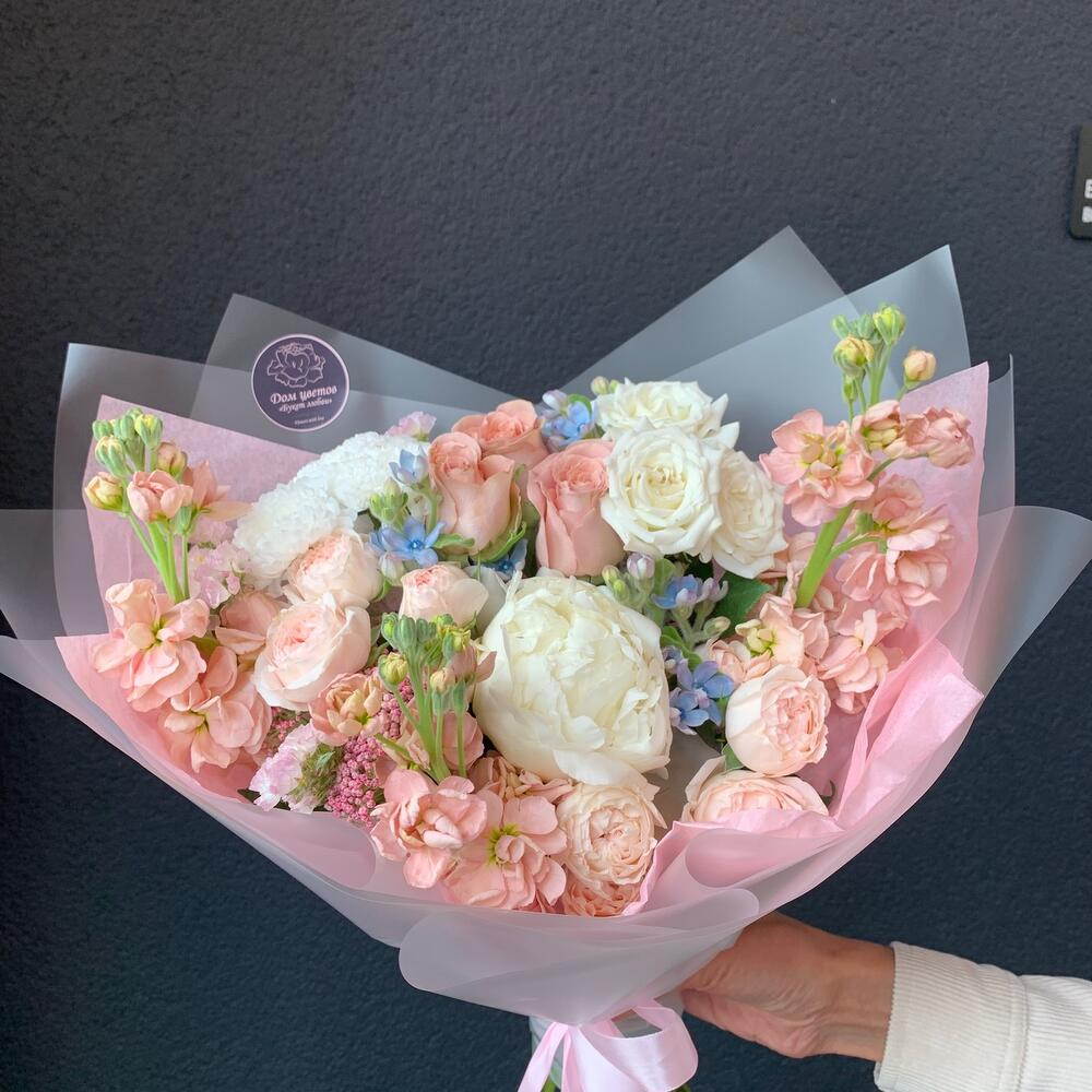 Букет из кустовой пионовидной розы, пиона и маттиолы «Радость»