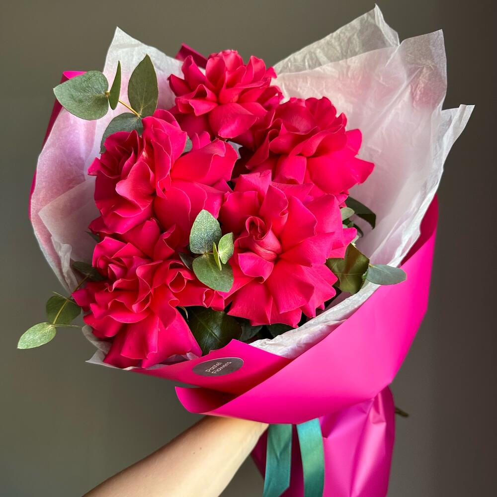 Букет из малиновых французских роз с эвкалиптом