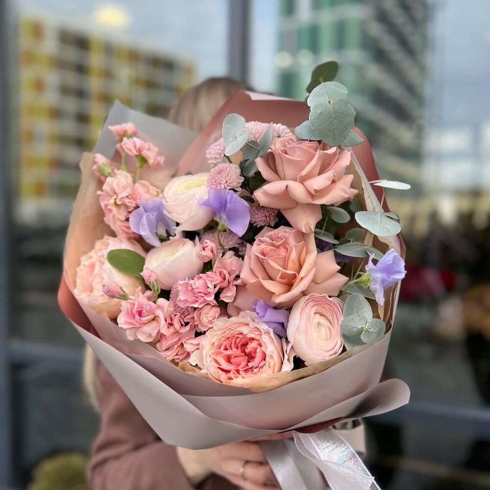 Букет из Пионовидный роз, Ранункулюсов и ароматных цветов