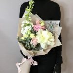 Маттиола – 1 шт.Кустовая роза – 1 шт.Роза Эквадор – 1 шт.Эустома – 1 шт.Лента атласная – 1 шт.Фисташка – 2 шт.Французская роза – 1 шт.Пленка матовая – 1 шт.подкормка для срезанных цветов – 1 шт.