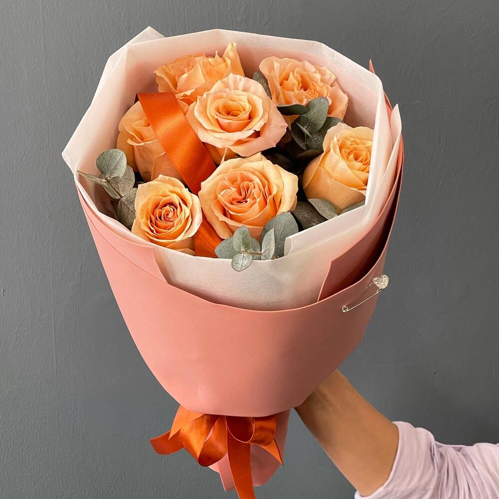 Лента – 1 шт.Эвкалипт – 2 шт.Роза одноголовая – 7 шт.Упаковка дизайнерская – 2 шт.игла декоративная – 1 шт.