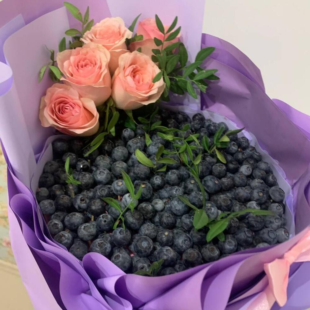 Голубика – 600 гр.Фисташка пучок – 1 шт.Дизайнерская упаковка – 1 шт.розы эквадор (60 см) – 5 шт.