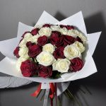 Упаковка – 1 шт. Атласная лента – 1 шт. Красная роза – 17 шт. белая роза – 20 шт.