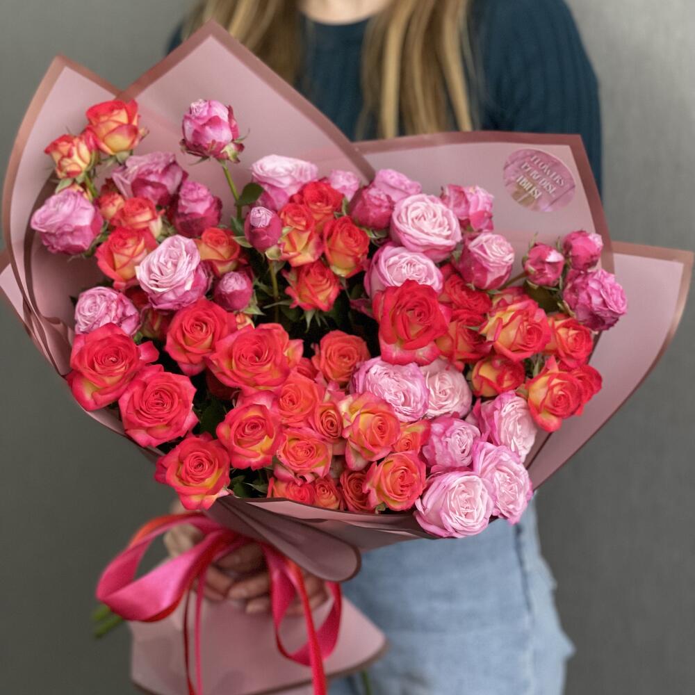 Упаковка – 1 шт. Атласная лента – 1 шт. роза кустовая (веток) – 10 шт.