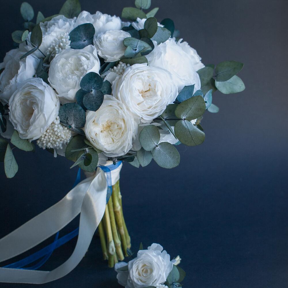 стабилизированная пионовидная роза – 17 шт.Эвкалипт – 20 шт.гортензия стабилизированная – 1 шт.