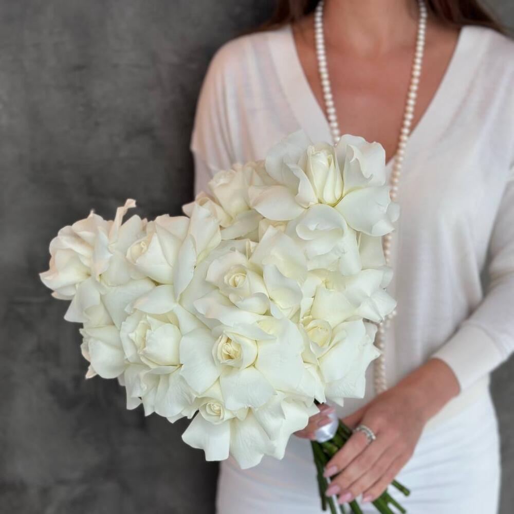 Подарочная упаковка – 1 шт.Лента атлас – 1 шт.Роза белая одноголовая – 19 шт.средство для продления жизни срезанных цветов – 1 шт.