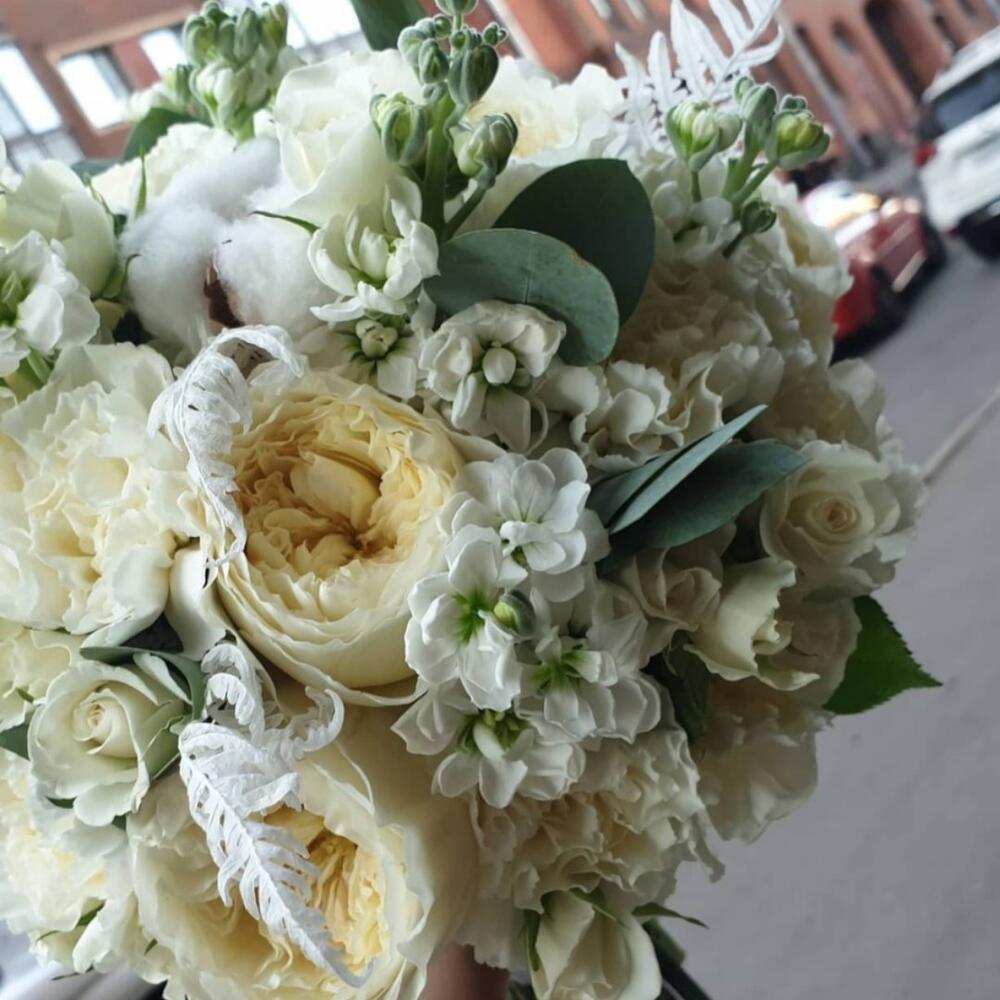 Хлопок натуральный – 3 шт.Роза пионовидная одноголовая – 9 шт.Маттиола белая – 7 шт.Диантус – 9 шт.Роза кустовая – 6 шт.Сухоцвет – 5 шт.Лента атласная – 3 шт.