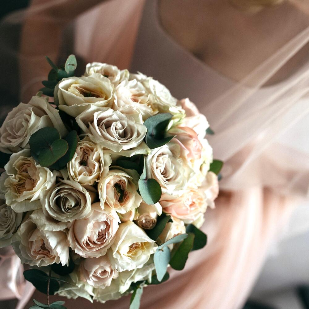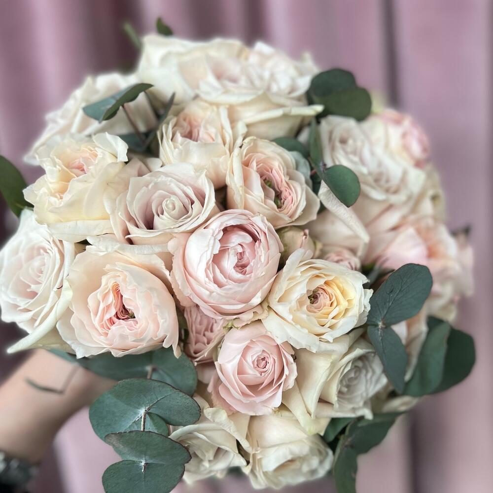 Эвкалипт – 3 шт.Пионовидная роза – 9 шт.Атласная лента – 2 шт.Кустовая пионовидная роза – 7 шт.Одноголовая роза – 13 шт.