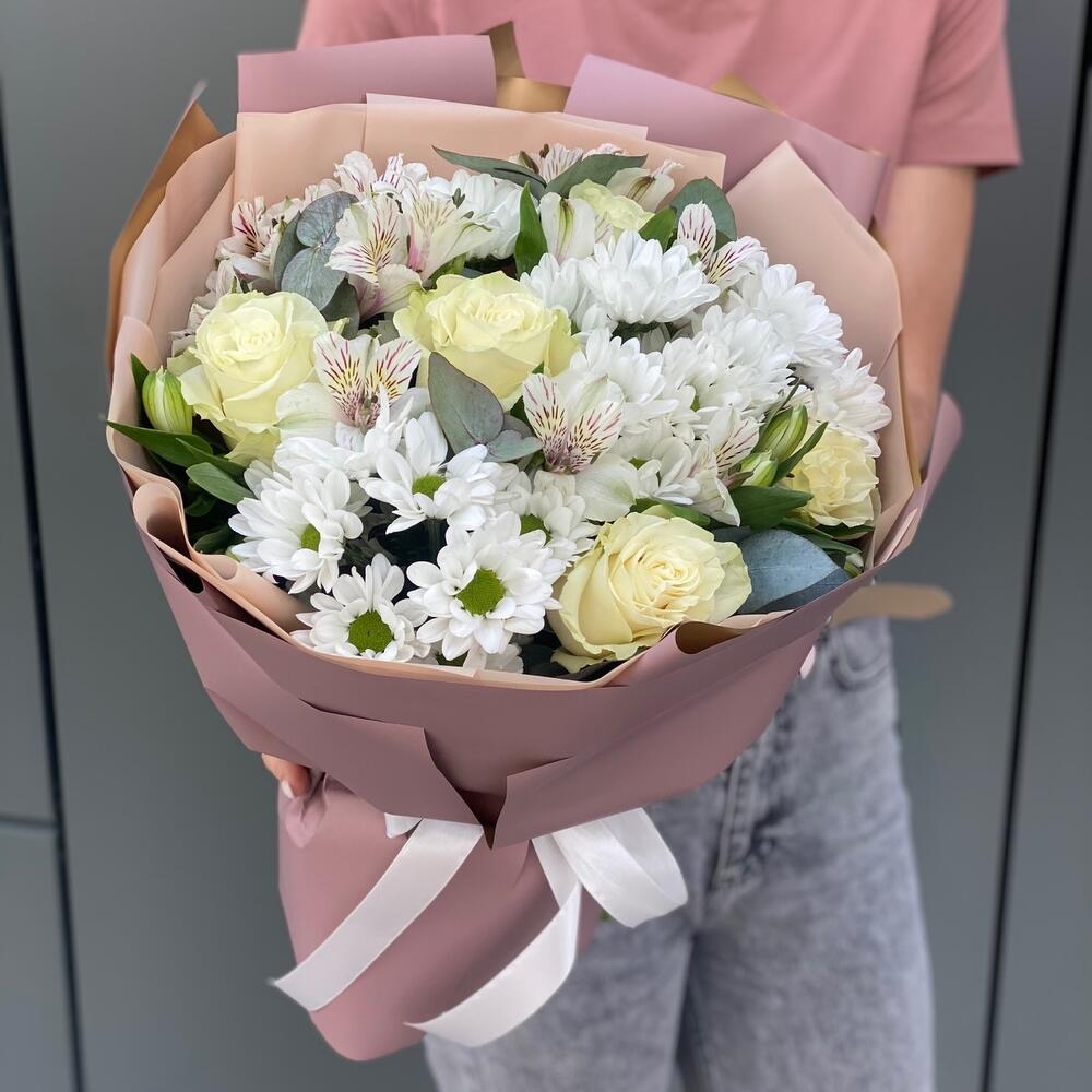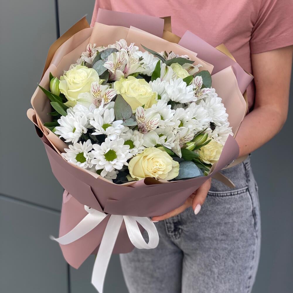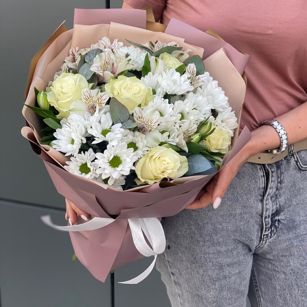Букет из роз, хризантемы и альстромерии в оформлении!