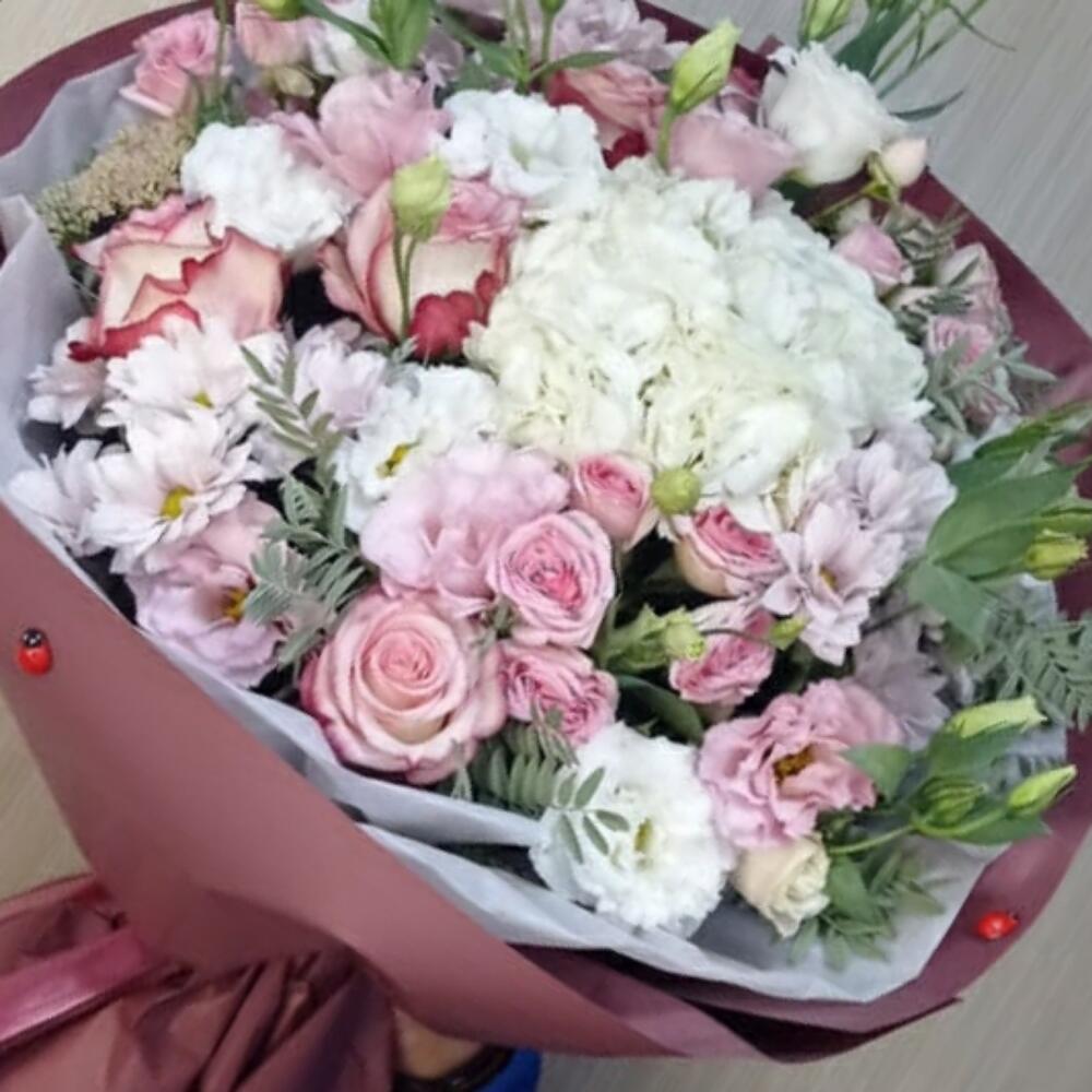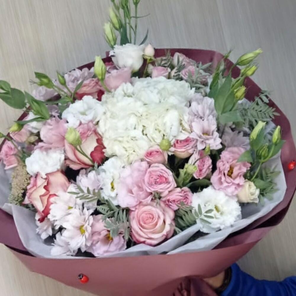 розы эквадор (60 см) – 3 шт. Кустовая роза – 3 шт. Гортензия – 1 шт. Лизиантус Алиса белый – 5 шт.