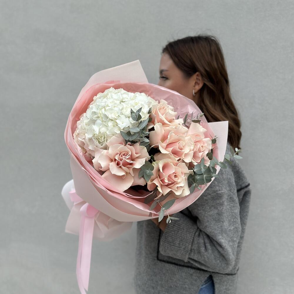 Изящный букет из ажурных роз, гортензии и изумрудного эвкалипта.