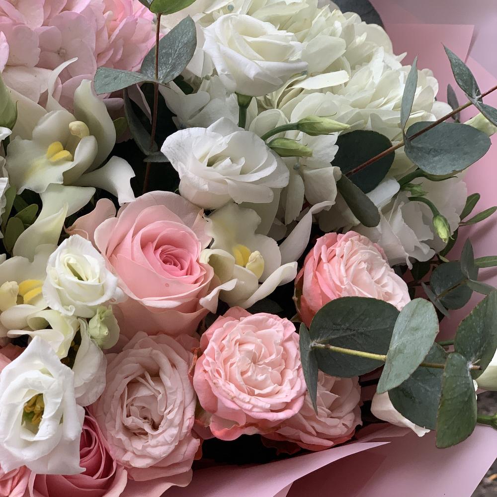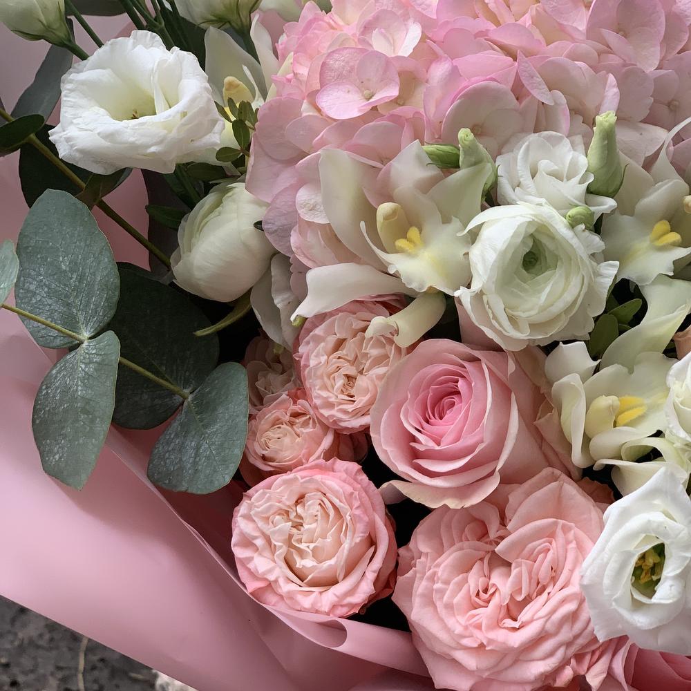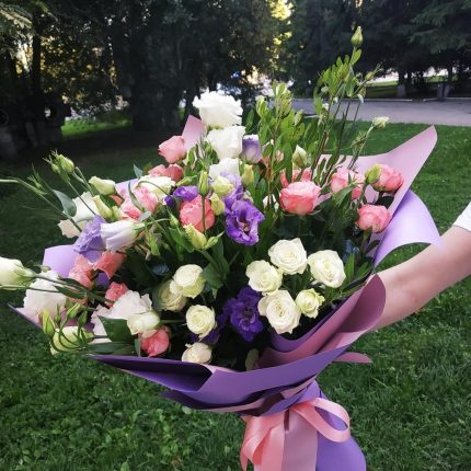 Букет из пионовидных роз, эустом и альстромерий