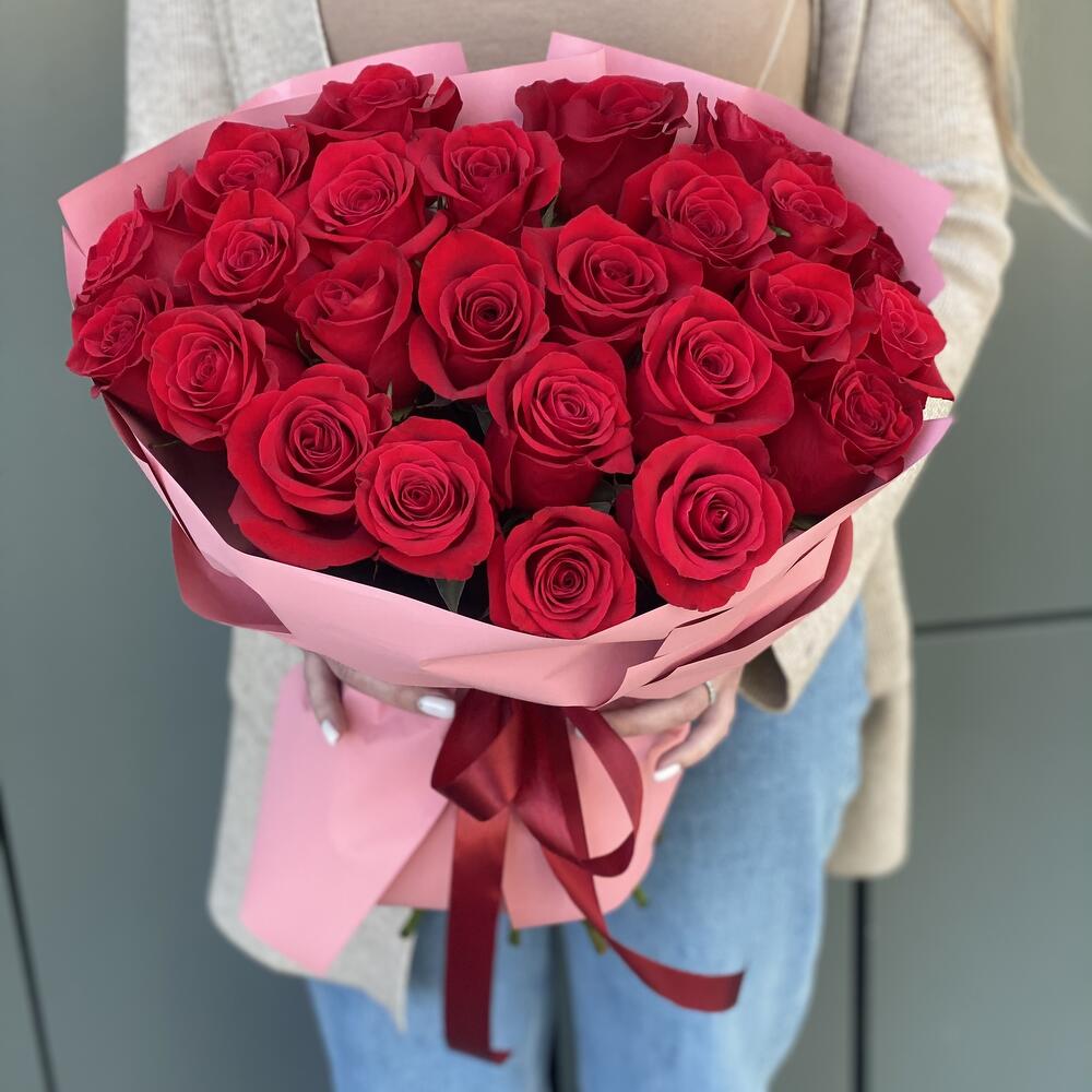 роза красная фридом – 25 шт. Оформление – 1 шт.