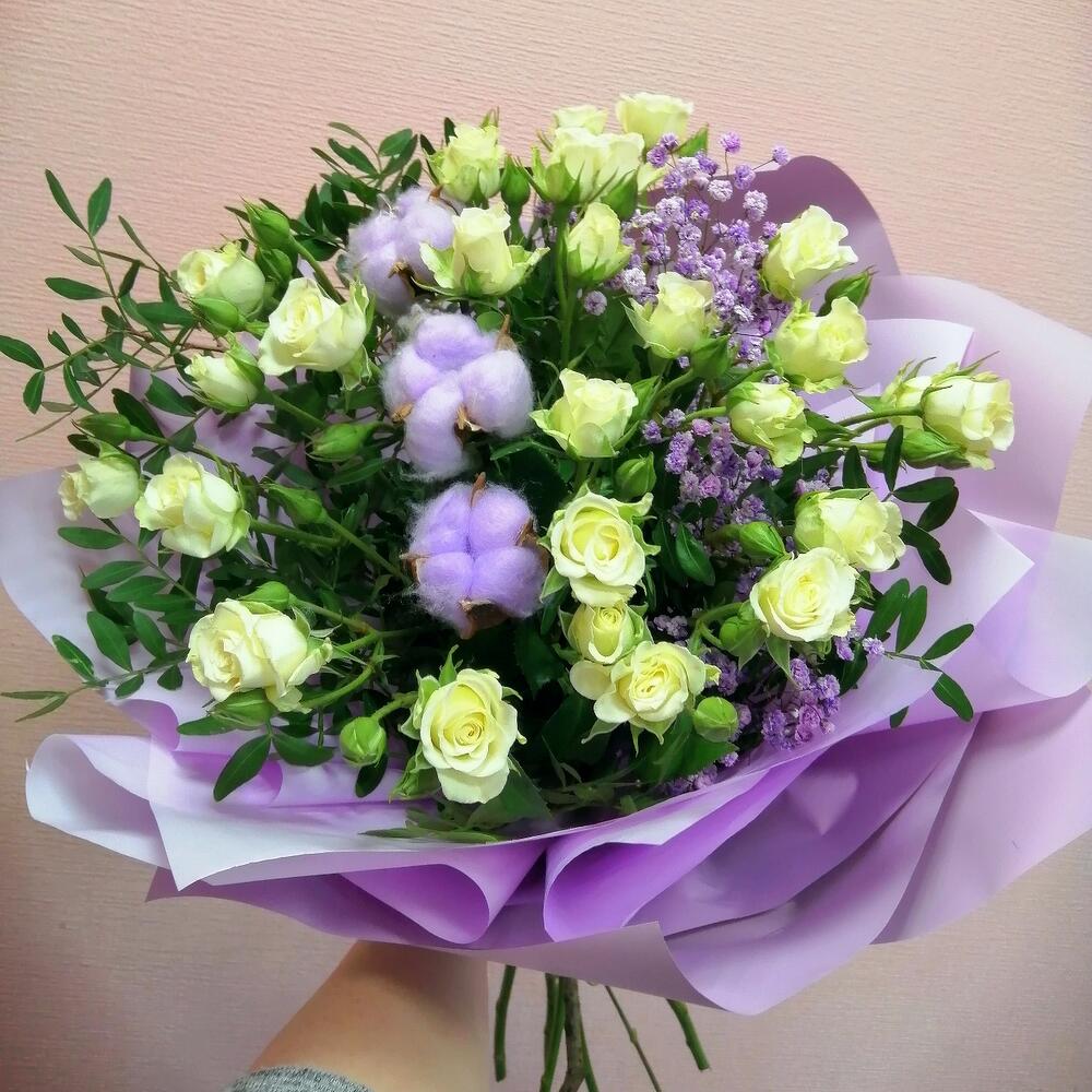 Роза кустовая – 5 шт.Гипсофила – 1 шт.Хлопок натуральный – 3 шт.Фисташка – 2 шт.Упаковка – 1 шт.