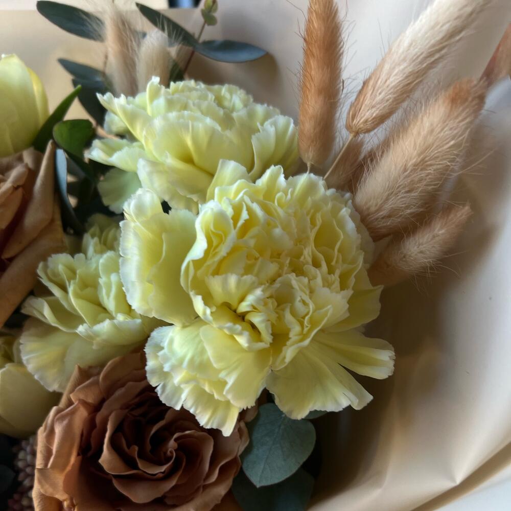 роза тоффи – 3 шт.Диантус – 3 шт.Роза кустовая – 2 шт.Тюльпан пионовидный – 3 шт.Лагурус – 7 шт.озатомус – 1 шт.Эвкалипт – 2 шт.Упаковка дизайнерская – 2 шт.Лента атласная – 1 шт.