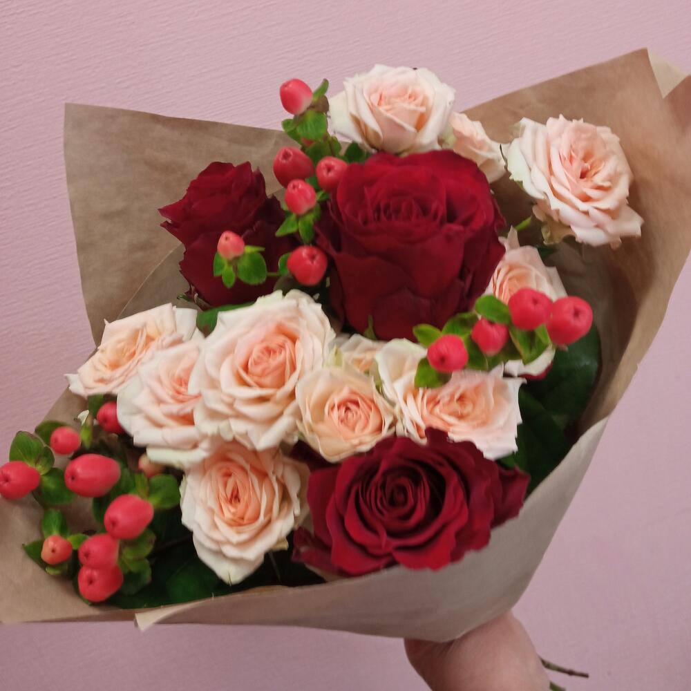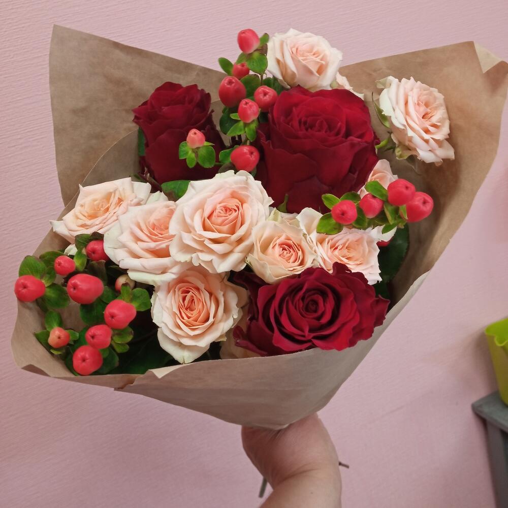Гиперикум – 3 шт.Лента – 1 шт.Роза кустовая – 3 шт.Роза – 3 шт.Упаковка – 1 шт.зелень декоративная – 2 шт.