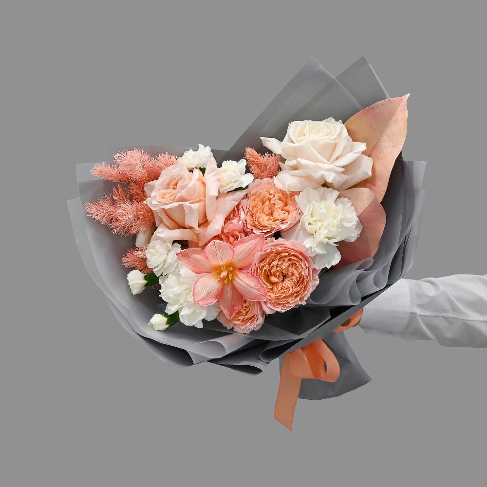 кустовая роза джульетта – 1 шт.Тюльпан – 1 шт.Диантус сортовой – 2 шт.Диантус кустовой – 2 шт.Роза shimmer – 1 шт.роза playa blanka – 1 шт.Лист магнолии – 2 шт.Аспарагус – 1 шт.Фисташка – 3 шт.Упаковка дизайнерская – 2 шт.Лента атласная – 1 шт.