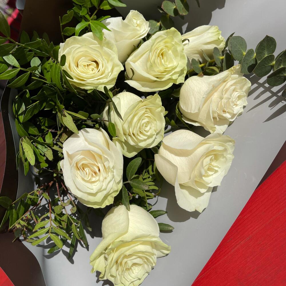 Роза премиум – 9 шт.Фисташка пучок – 3 шт.Эвкалипт – 1 шт.Бумага – 1 шт.Лента – 1 шт.