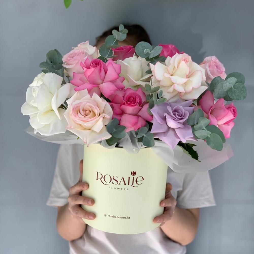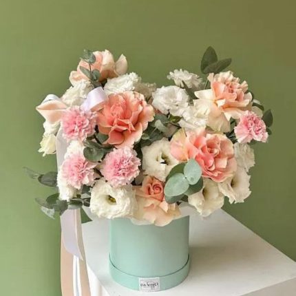 Авторская композиция с розами Мента в шляпной коробке