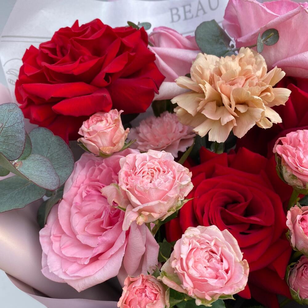 Букет «Влюбленность» (Премиальная роза O Hara, роза кустовая, роза красная, диантусы и эвкалипт)