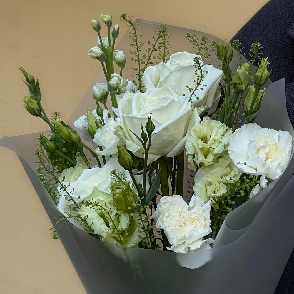 роза плая бланка – 3 шт.Гринбелл – 1 шт.Гвоздика – 3 шт.Лизиантус – 2 шт.Маттиола – 1 шт.