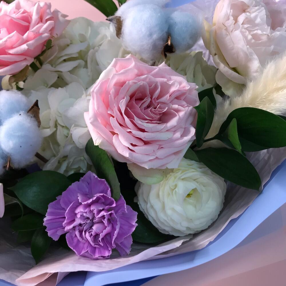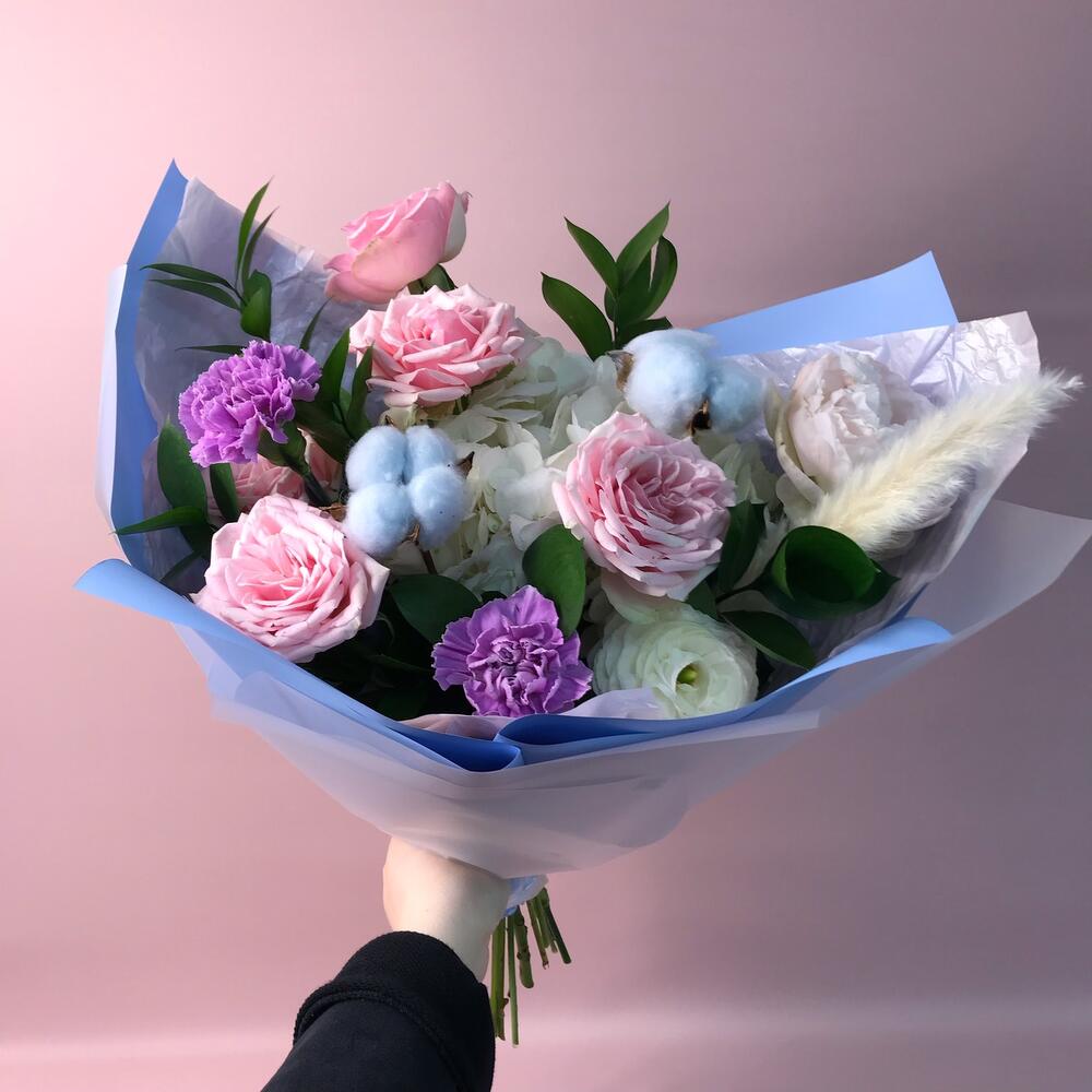 Гортензия – 1 шт.Рускус – 7 шт.Салал – 7 шт.Тишью – 4 шт.Ранункулюс – 1 шт.Роза садовая – 3 шт.Оформление – 1 шт.хлопок сухоцвет – 2 шт.ковыль сухоцвет – 1 шт.Диантус мун аква – 2 шт.Пион Италия – 1 шт.