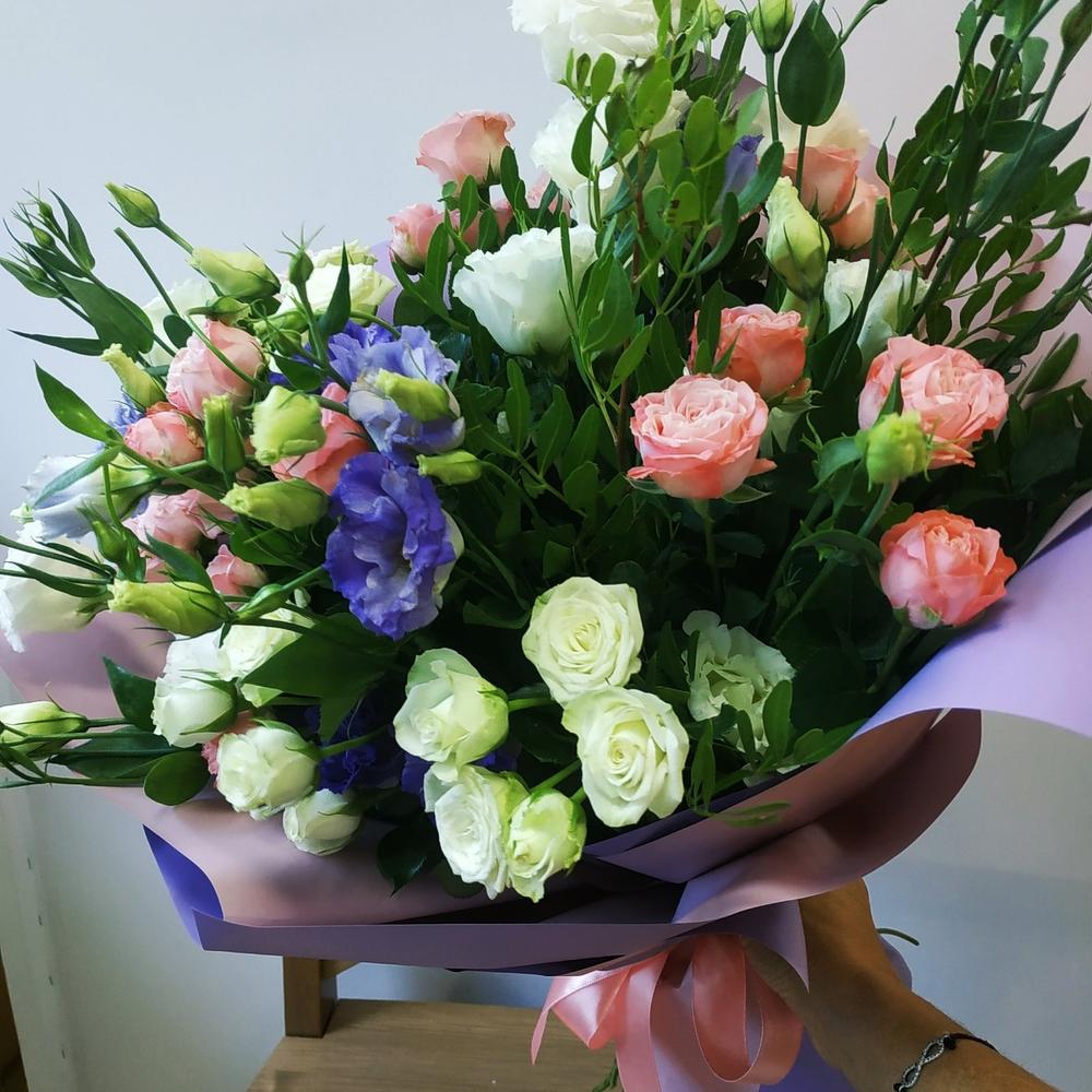 Кустовая роза – 7 шт. эустома белая – 5 шт. эустома синяя – 5 шт. Фисташка – 5 шт. Упаковка дизайнерская – 5 шт. Лента атласная – 1 шт. Пакет подарочный – 1 шт.