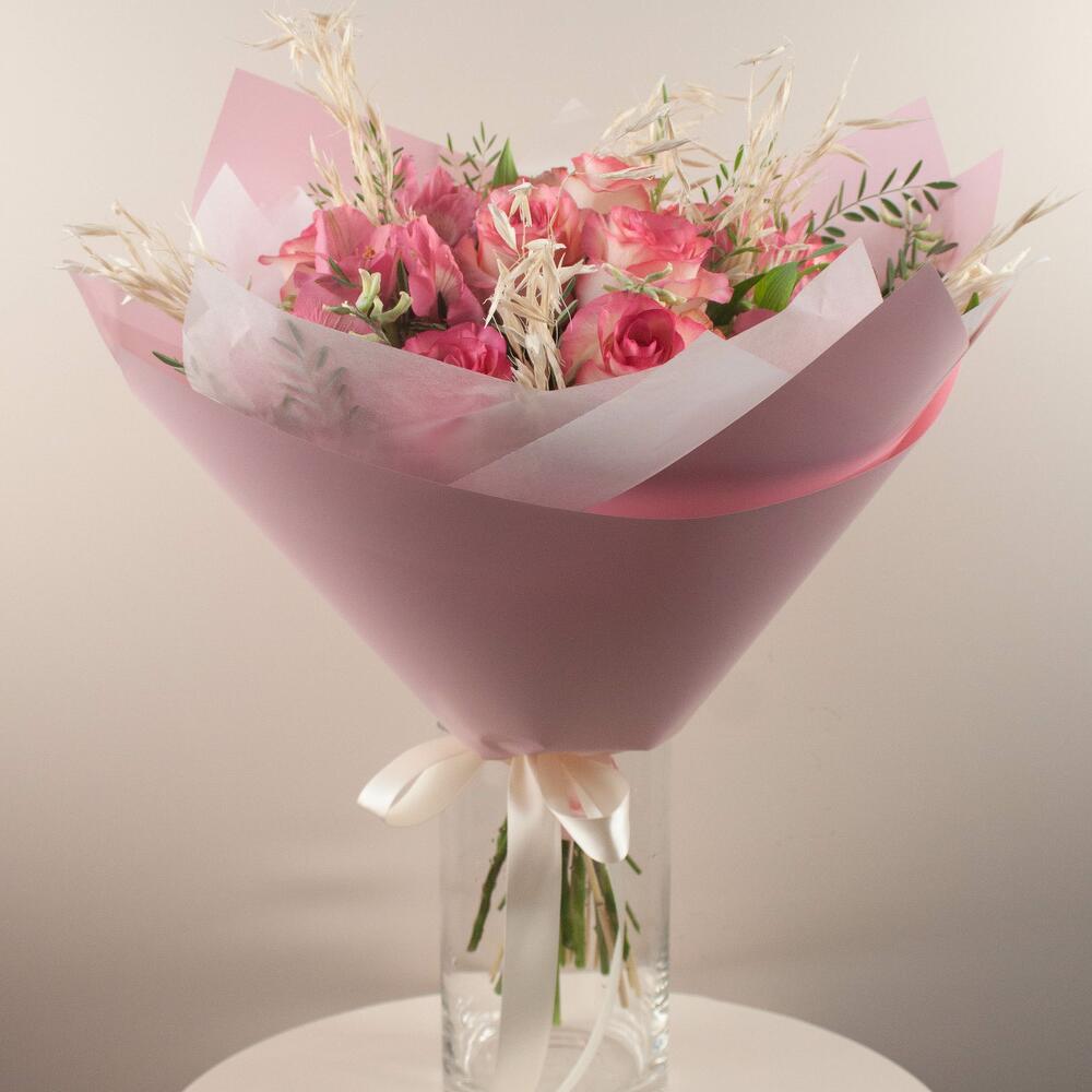 Роза – 9 шт. Альстромерия – 3 шт. Овес – 1 шт. Оформление – 1 шт.