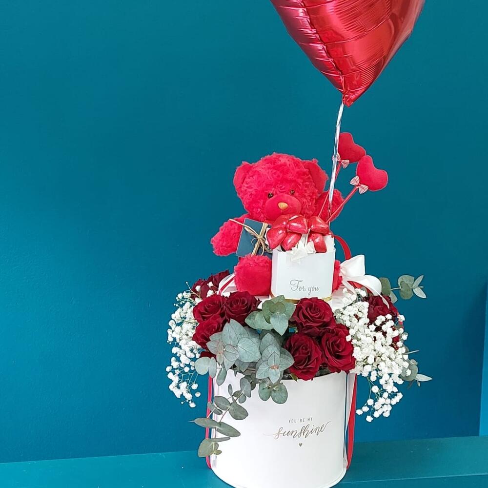 Роза – 11 шт. Гипсофила – 2 шт. Эвкалипт – 1 шт. Медведь плюшевый – 1 шт. серца серца – 1 шт. Коробка шляпная – 1 шт.