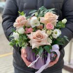 Роза – 3 шт. Эустома – 3 шт. Кустовая роза пионовидная – 3 шт. Писташ – 5 шт. Итальянский рускус – 1 шт.