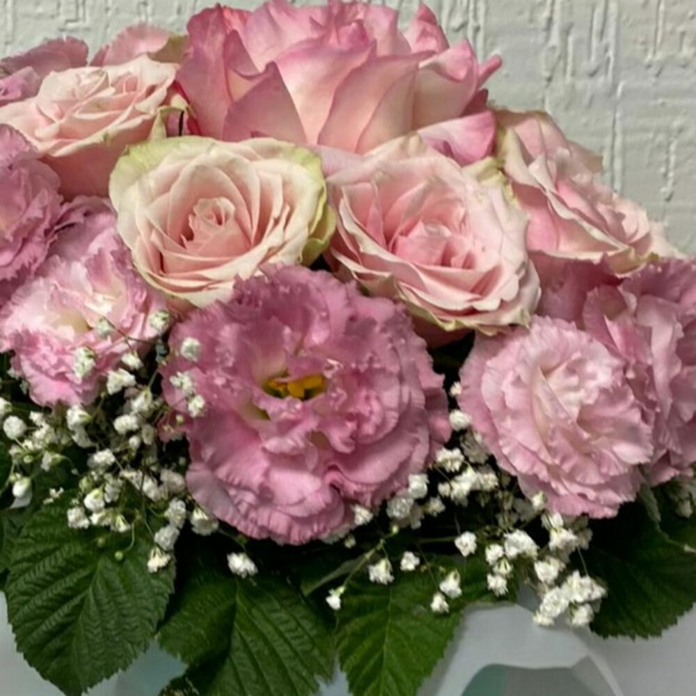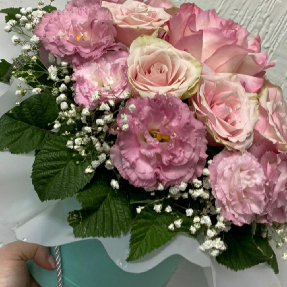 Гипсофила – 2 шт. Роза розовая – 7 шт. Лизиантус розовый – 5 шт.
