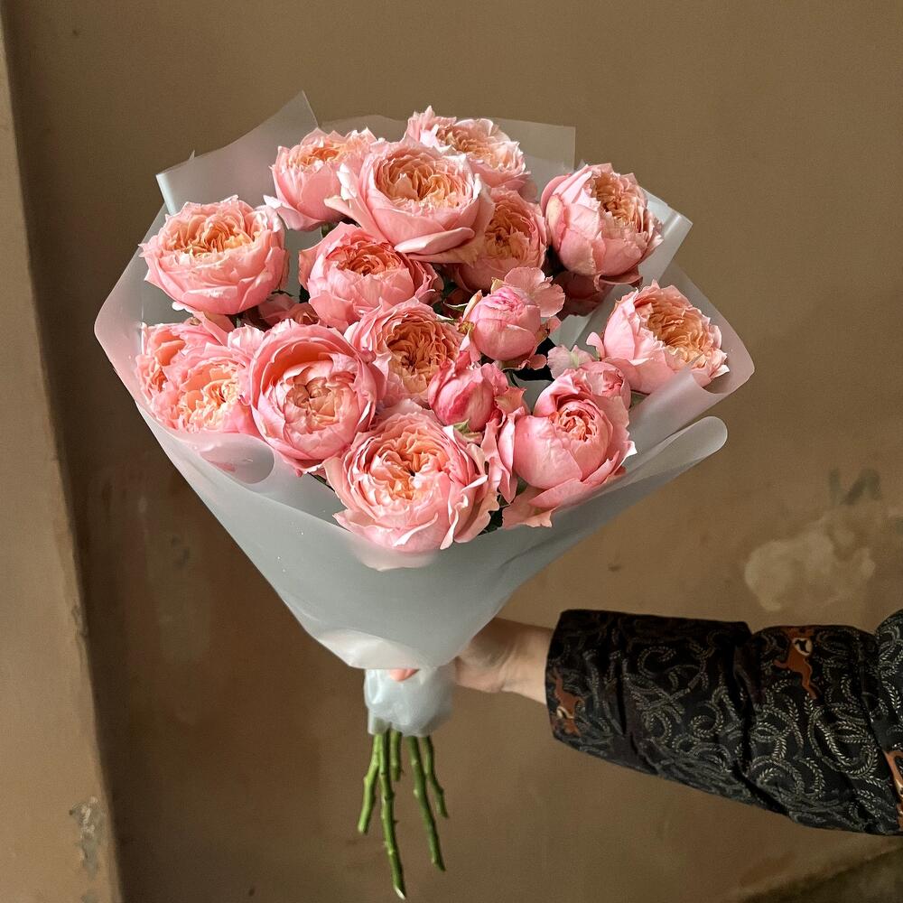 Авторская упаковка – 1 шт.пионовидная кустовая роза джульетта – 5 шт.