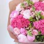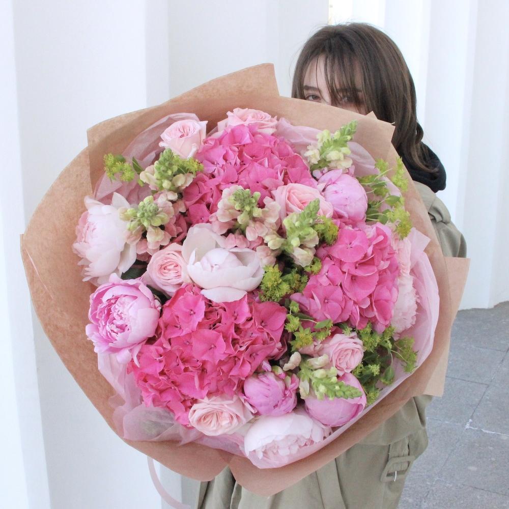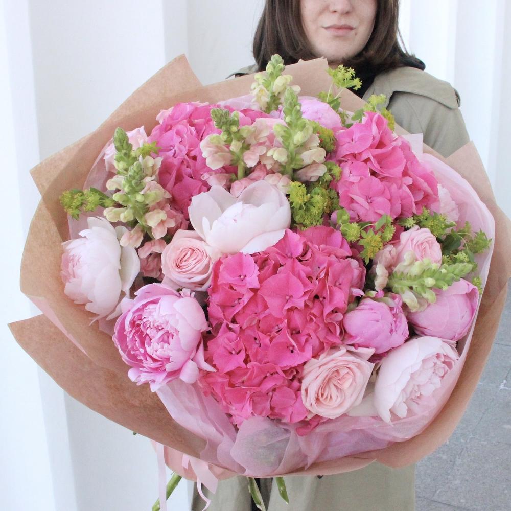 Розовый букет с гортензиями, пионами, львиным зевом, пионоидными розами и садовой зеленью в лаконичной упаковке.
