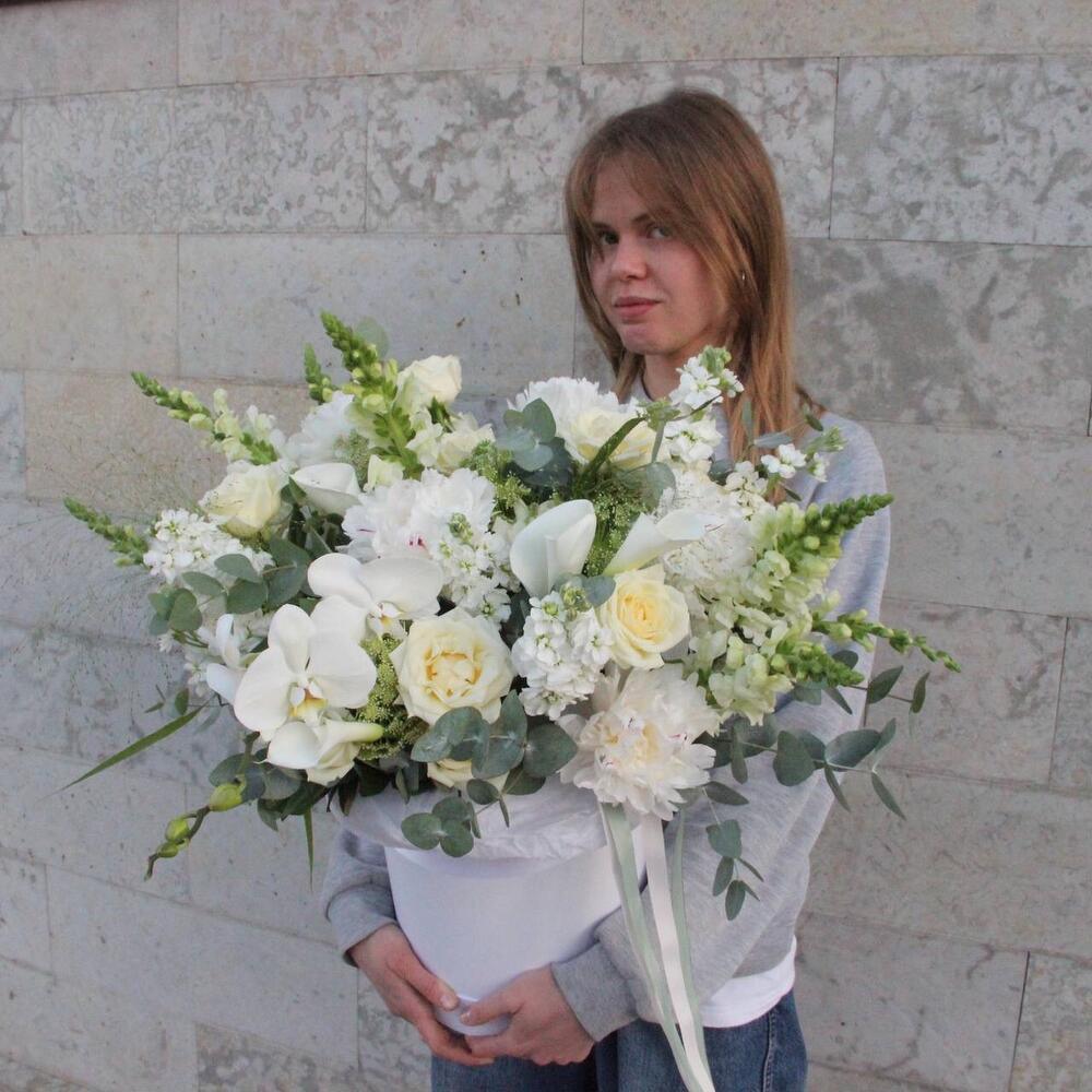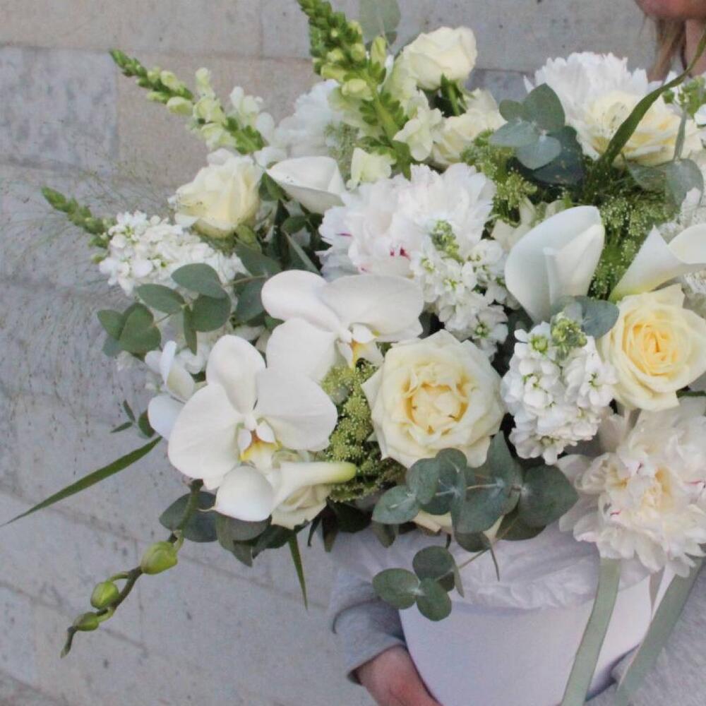 орхидея – 2 шт.Сирень – 5 шт.Роза – 9 шт.Львиный зев – 7 шт.Маттиола – 7 шт.Амми – 5 шт.Лизиантус – 4 шт.Паникум – 4 шт.Эвкалипт – 11 шт.Коробка шляпная – 1 шт.ленты атласные – 2 шт.