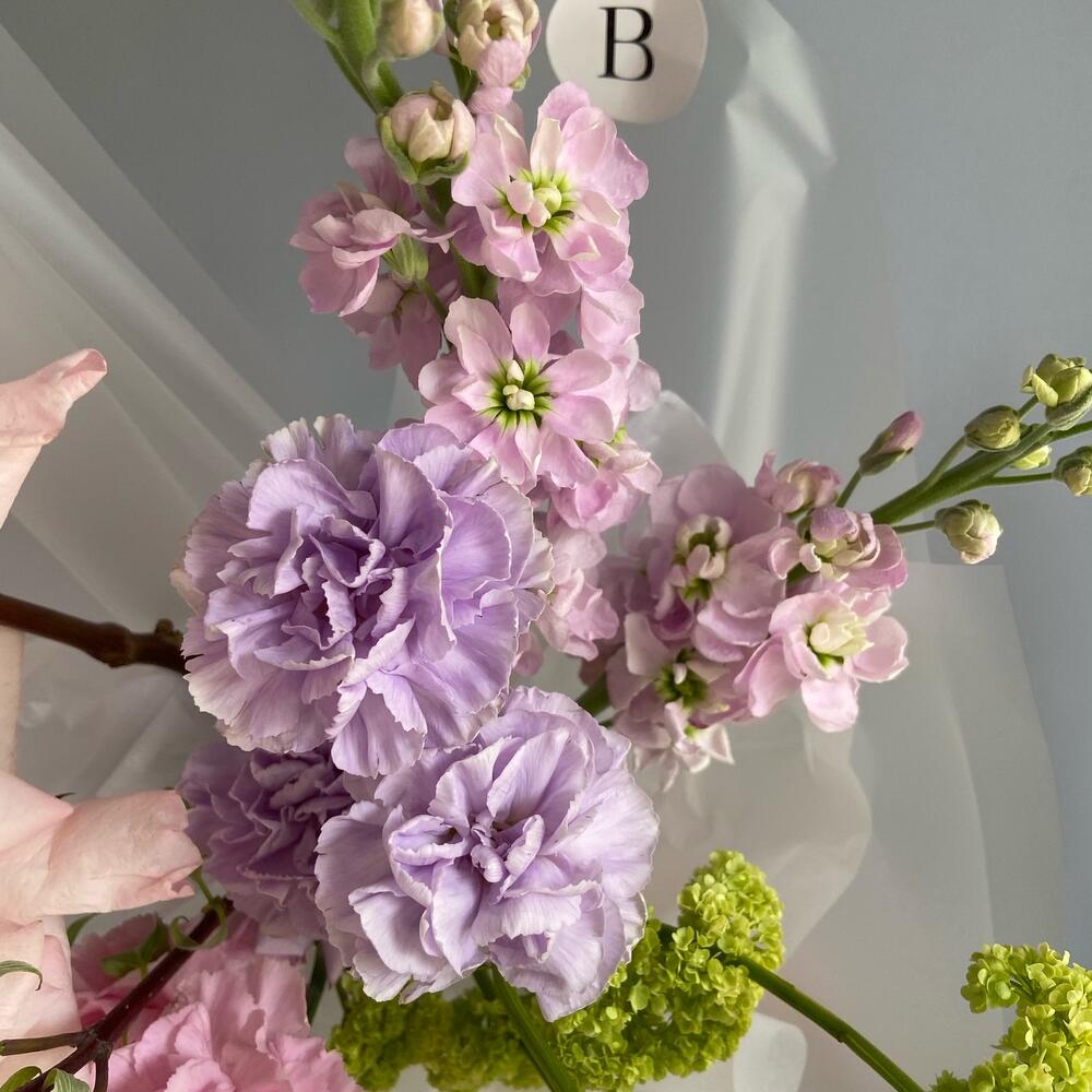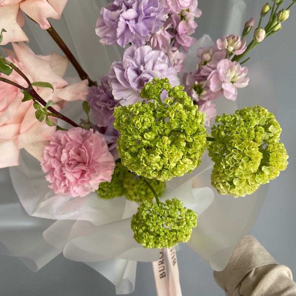 Pink O’Hara роза – 2 шт.Вибурнум – 1 шт.Диантус – 5 шт.Маттиола – 2 шт.Упаковка дизайнерская – 1 шт.Писташ – 2 шт.рекомендация по уходу – 1 шт.