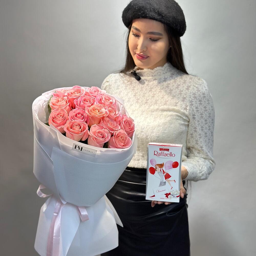 Нежный букет из 15 роз, в подарок Raffaello 70 грамм.