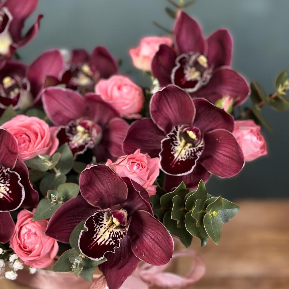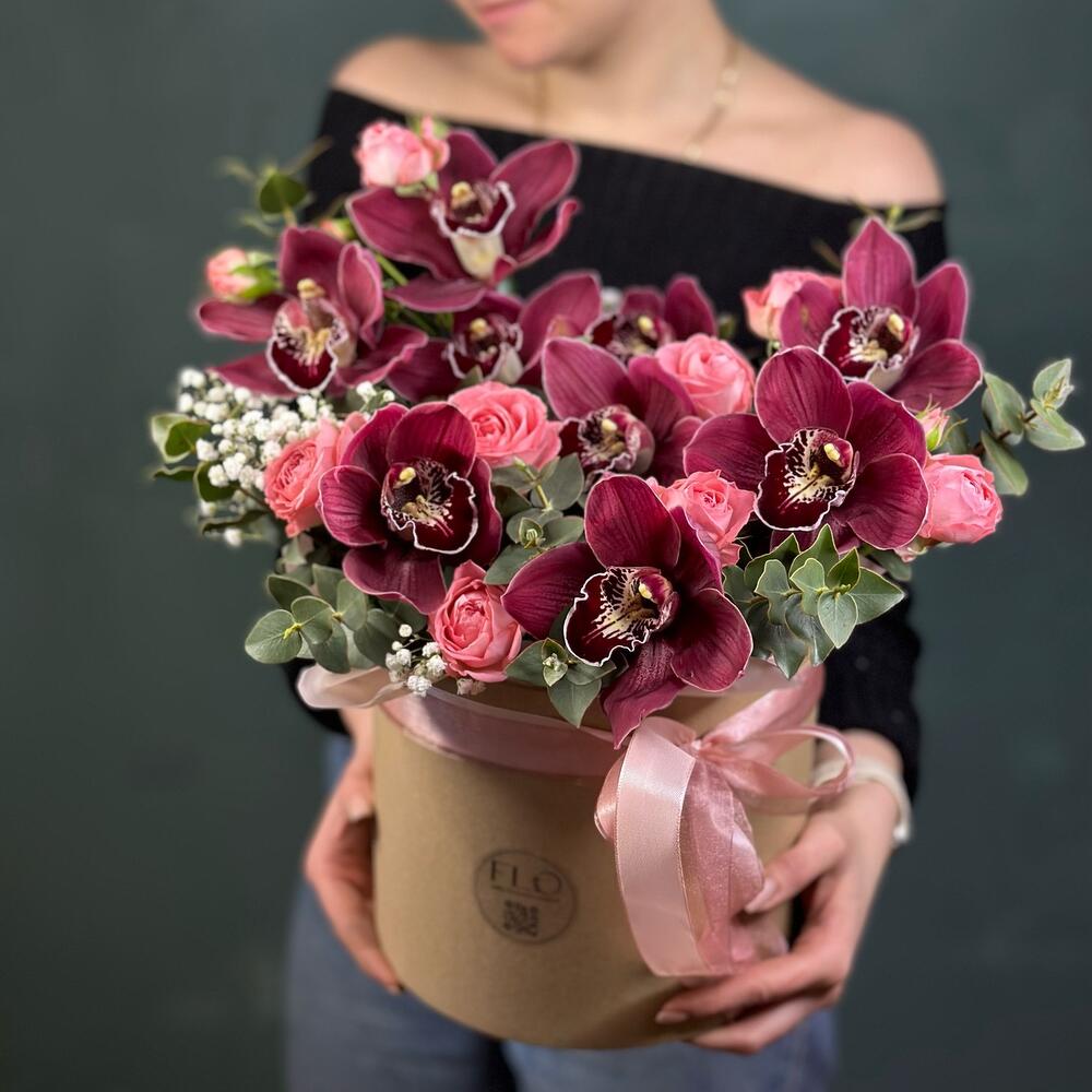 Гипсофила – 1 шт.Орхидея Цимбидиум – 9 шт.Эвкалипт – 4 шт.Лента атласная – 2 шт.Коробка шляпная – 1 шт.Роза кустовая пионовидная – 2 шт.